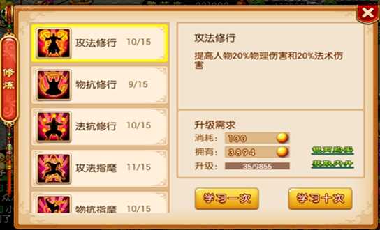 提升修煉,直接增加人物、仆從、皇子的攻擊力和防御力等,從而提升戰斗力。提升學習修煉,需要內丹,通過游戲內活動等獲得內丹。內丹主要獲取渠道:進貢、挑戰皇上、派系精英賽、商城兌換(龍鳳幣、聲望積分)。