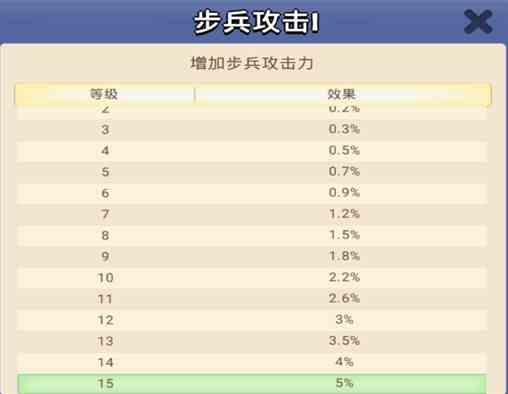 首先,步兵攻擊1級和15級效果提升5%。可見,水平越高,取得的成績就越多。換句話說,盡量獲得更多的天賦,從而獲得最大的加成效果。